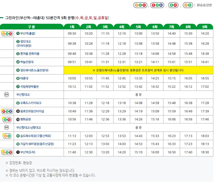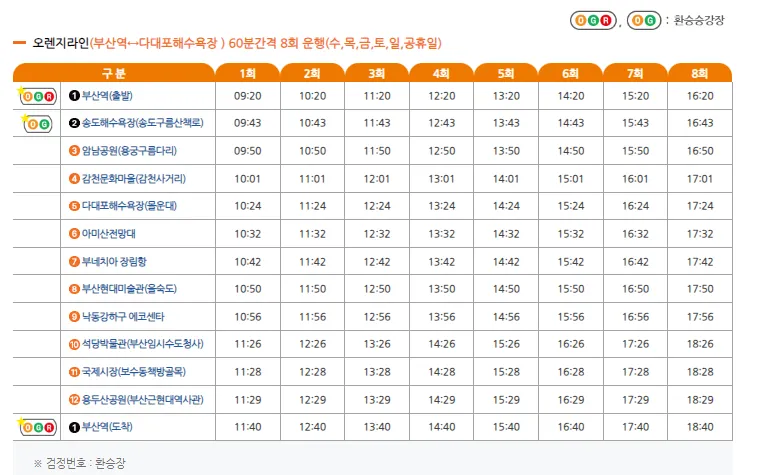 블루라인(용호만유람선터미널↔해동용궁사), 오렌지라인(부산역↔다대포)